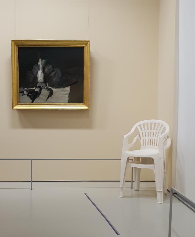 L’installation de Sam Krack qui forme Sinistre(s) manifeste avec malice cette quête d’éternel propre à la sacralisation de l’oeuvre d’art. Composée de deux chaises de jardin reproduites en faïence blanche, de débris en plastique d’une de ces mêmes chaises, ainsi que de cinq toiles, l’oeuvre est née d’un sinistre survenu sur une œuvre précédente, Monobloc (Salon de jardin), exposée dans un cadre muséal et détruite par un visiteur trompé par la transcription fidèle de l’objet réduit à sa fonction d’usage : l’installation détournait, en l’anoblissant dans un matériau fragile, l’une des assises les plus bon marché, standardisée, attribut par excellence d’une vie de campagne réduite à un morceau de jardin. Un renversement de l’oeuvre initiale s’opère à travers la reprise des débris de céramique en plastique, par lequel la chaise retourne à son matériau d’origine. Ce procédé, associé à la reproduction en peinture des photographies documentaires nécessaires aux constats d’assurance, en même temps qu’il mime les procédures de classement et de mémorisation administrative des évènements, témoigne d’un exercice temporel laborieux et lent, quasi absurde, de résistance artistique à la brièveté de la matière.