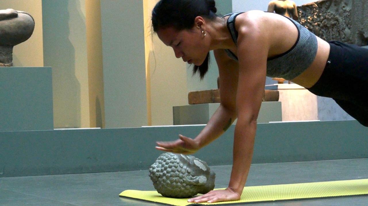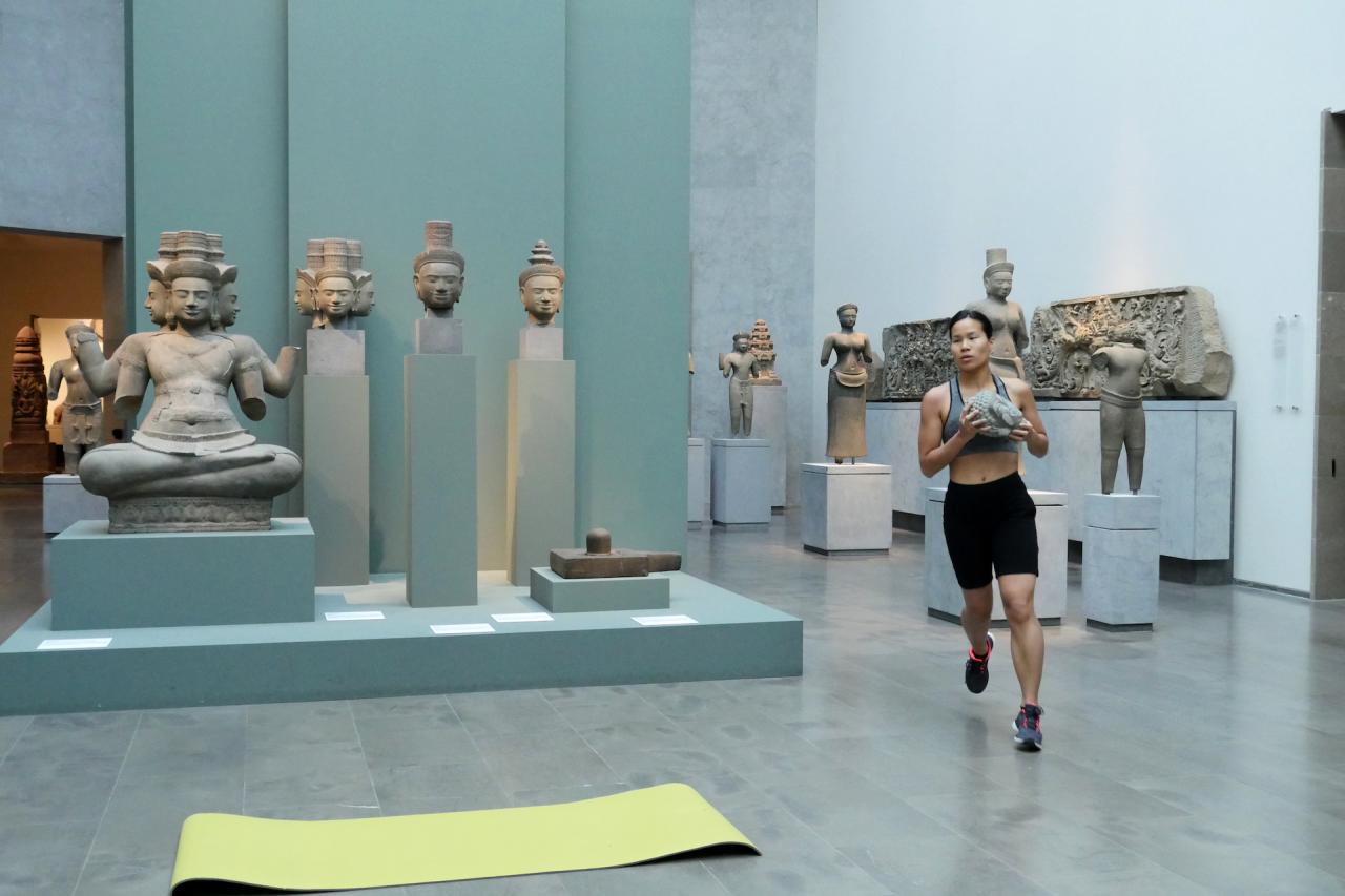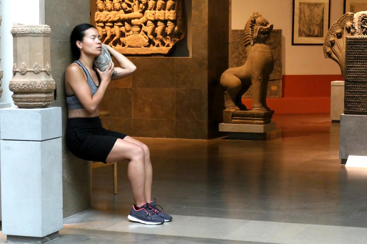 La tête de bouddha est portée au cours d’un entraînement sportif dans les espaces du musée. Je cherche les moyens de me déplacer et de trouver mon équilibre avec cette lourde tête qui m’accompagne. Elle ralentit mon allure, elle semble être une entrave à mon parcours, au fur-et-à mesure elle se blottit contre mon corps, elle me renforce et me stimule. Porter/peser le poids de cette tête de bouddha au contact de mon corps, de mes mains, de mon visage, me permet de me réapproprier mon héritage et de rendre visible la relation au présent avec les sculptures de la collection du Musée Guimet.