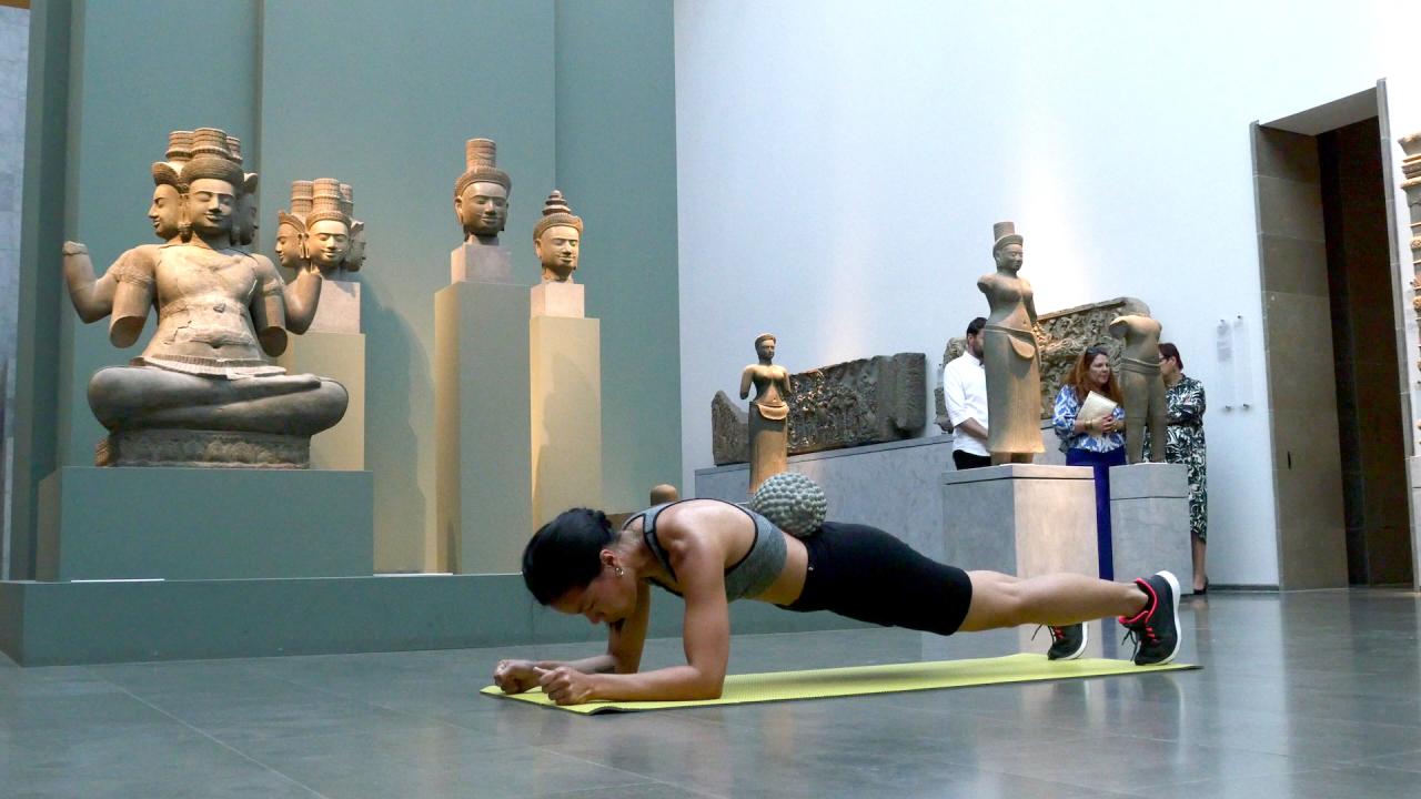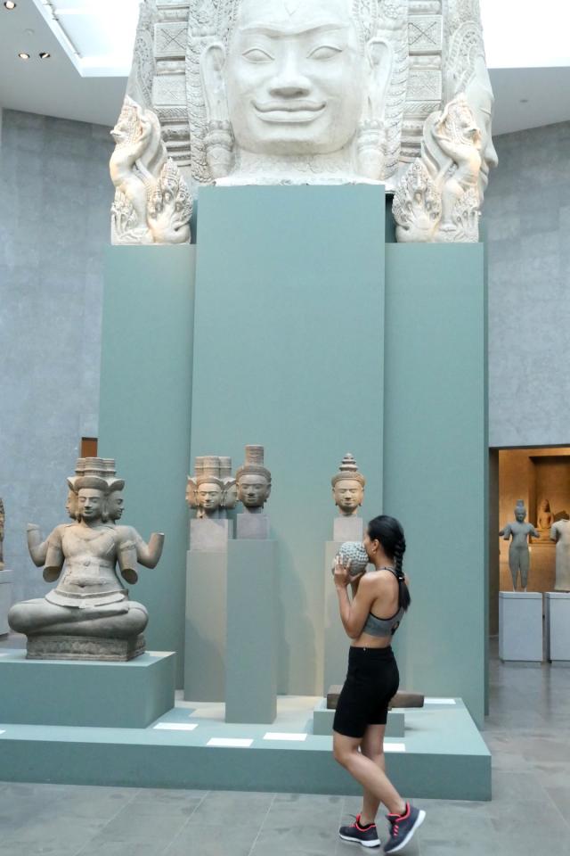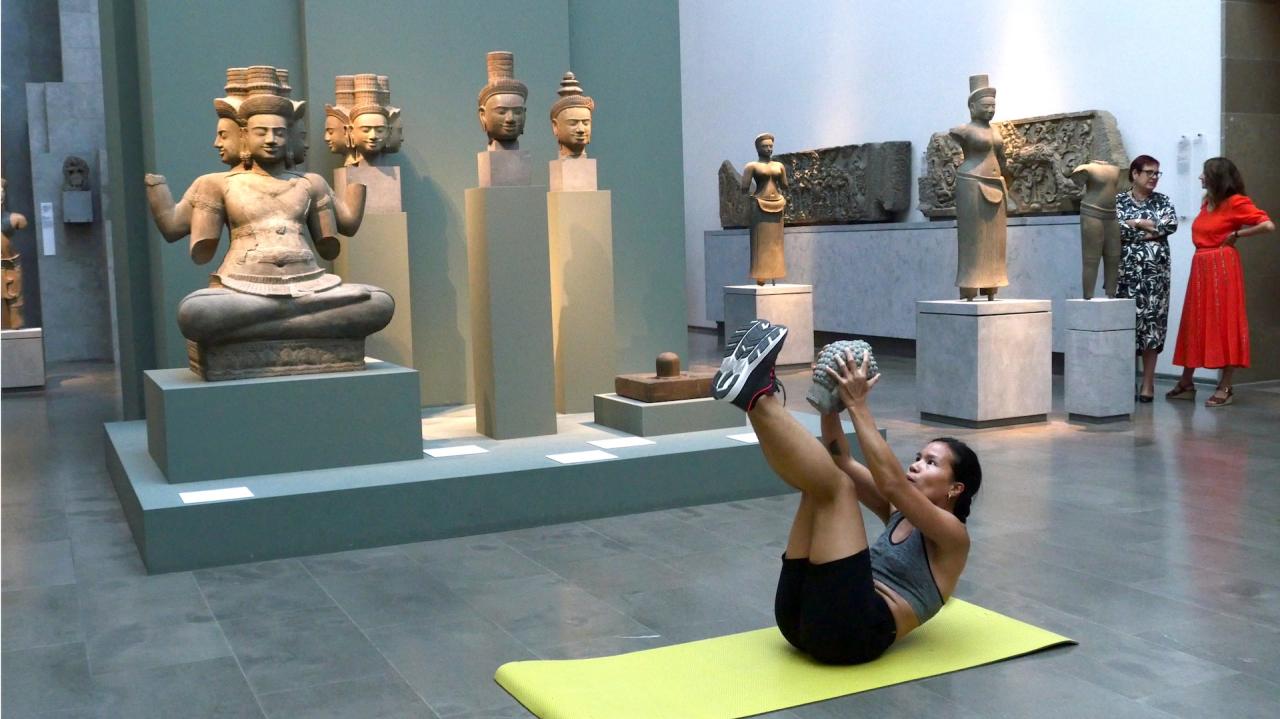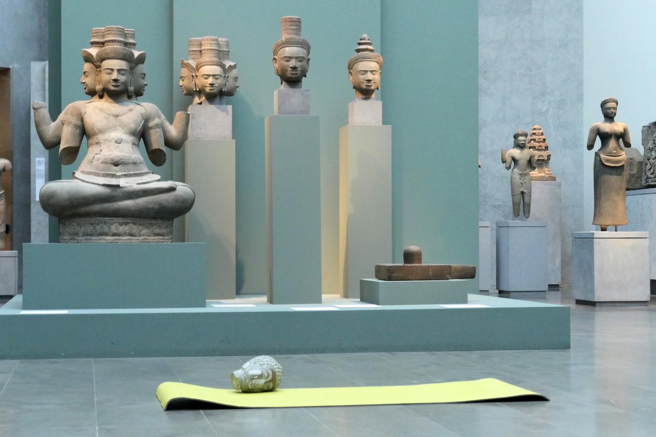 La tête de bouddha est portée au cours d’un entraînement sportif dans les espaces du musée. Je cherche les moyens de me déplacer et de trouver mon équilibre avec cette lourde tête qui m’accompagne. Elle ralentit mon allure, elle semble être une entrave à mon parcours, au fur-et-à mesure elle se blottit contre mon corps, elle me renforce et me stimule. Porter/peser le poids de cette tête de bouddha au contact de mon corps, de mes mains, de mon visage, me permet de me réapproprier mon héritage et de rendre visible la relation au présent avec les sculptures de la collection du Musée Guimet.