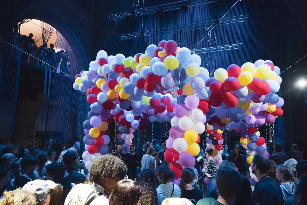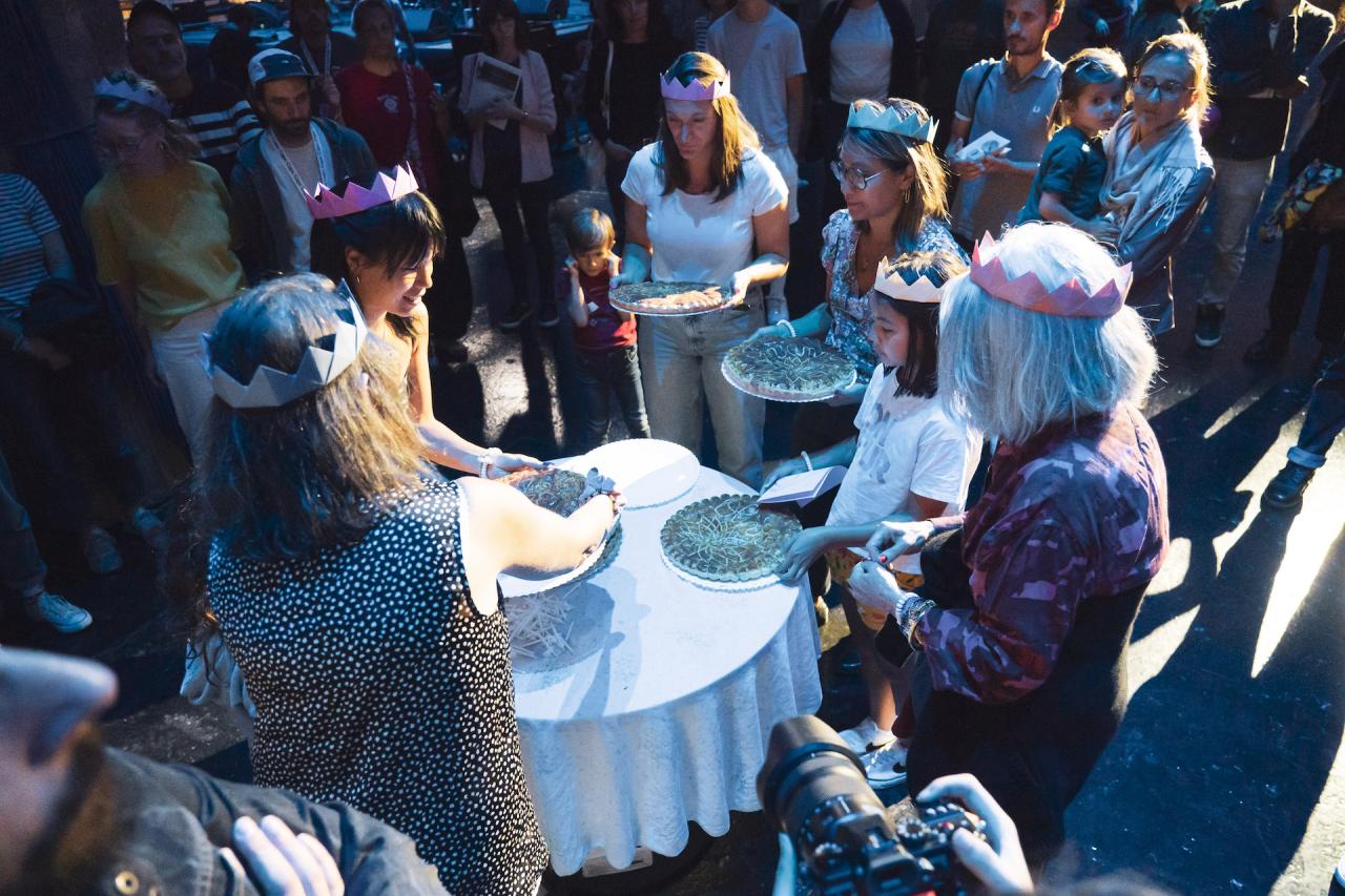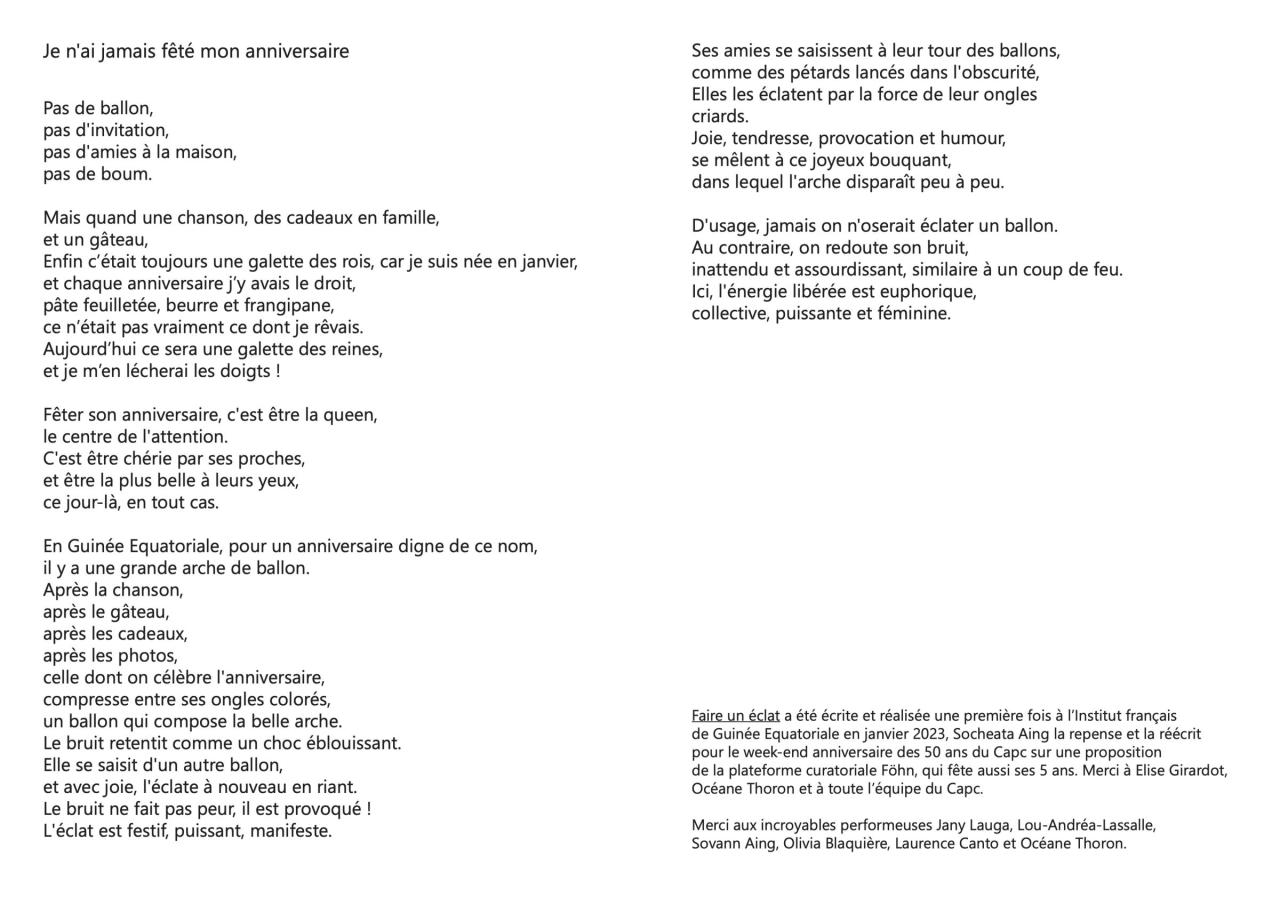 2023 : CAPC, Bordeaux, dans le cadre des 50 ans du CAPC, invitée par la plateforme curatoriale Föhn, 1200 ballons, bolduc, 6 galettes frangipane maison, 6 couronnes, 50 bougies, invitation papier, faux ongles, 30 min