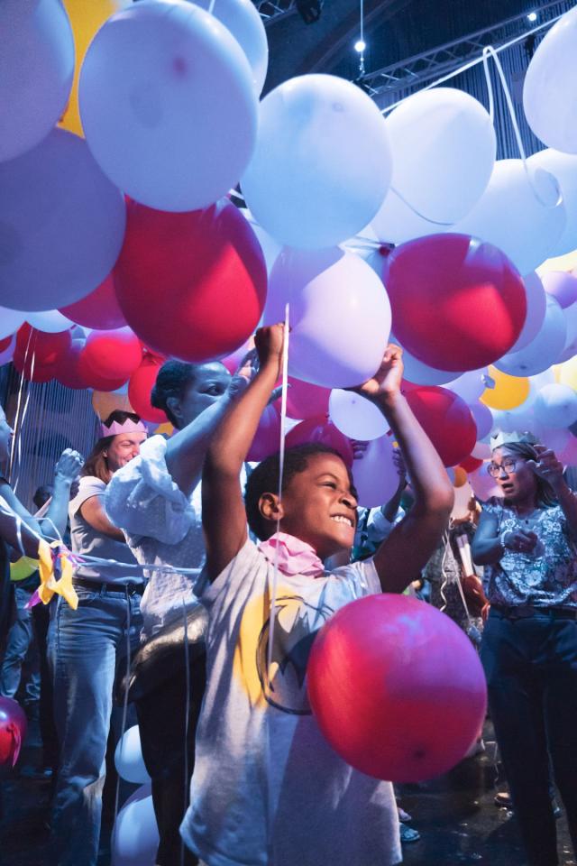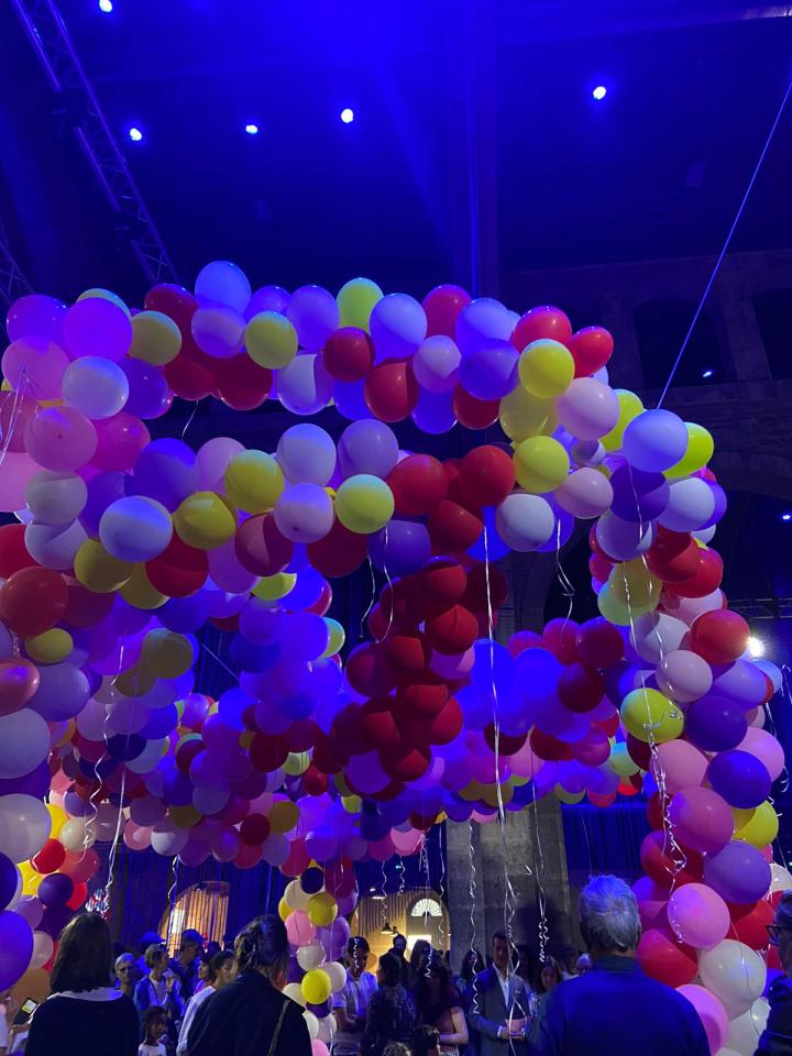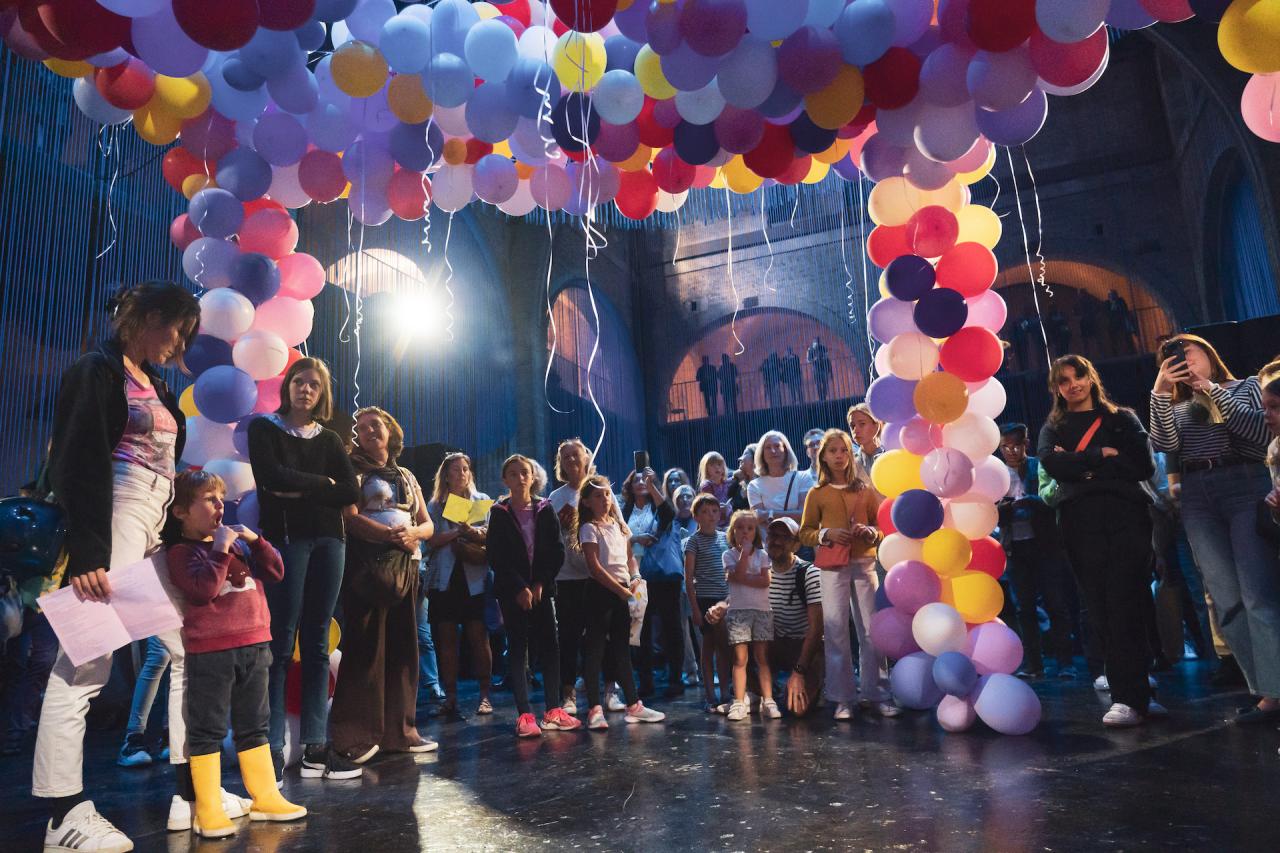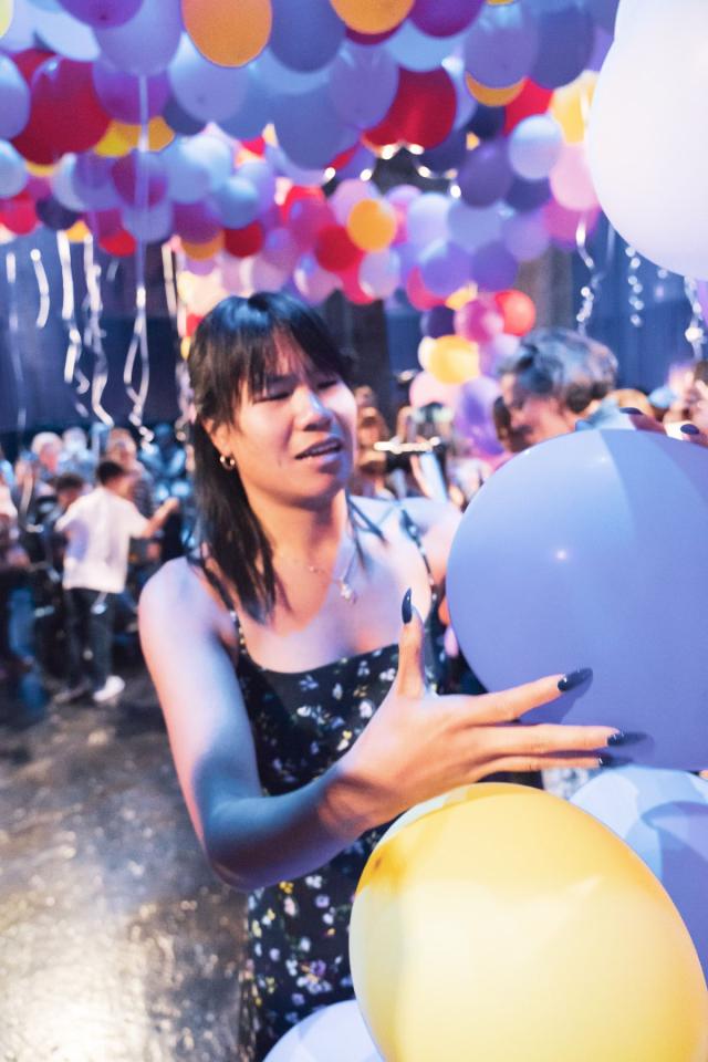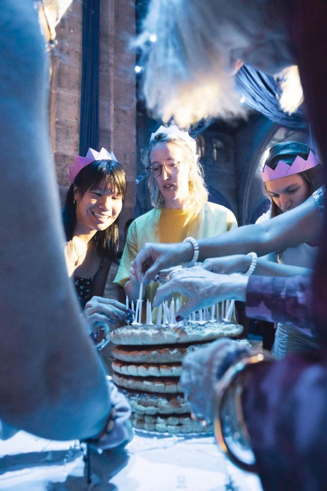 2023 : CAPC, Bordeaux, dans le cadre des 50 ans du CAPC, invitée par la plateforme curatoriale Föhn, 1200 ballons, bolduc, 6 galettes frangipane maison, 6 couronnes, 50 bougies, invitation papier, faux ongles, 30 min