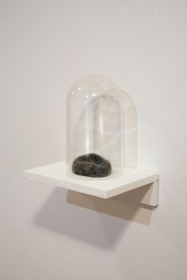Écrin, 2024, cheveux blancs de sa mère, vue du projet d’exposition Jardin secret, 2025, dans le cadre de l’exposition collective Mezzanine Sud – Prix des Amis des Abattoirs, 2025, Les Abattoirs, Musée – Frac Occitanie Toulouse, Toulouse, photo Cyril Boixel