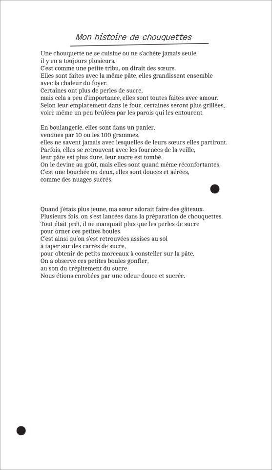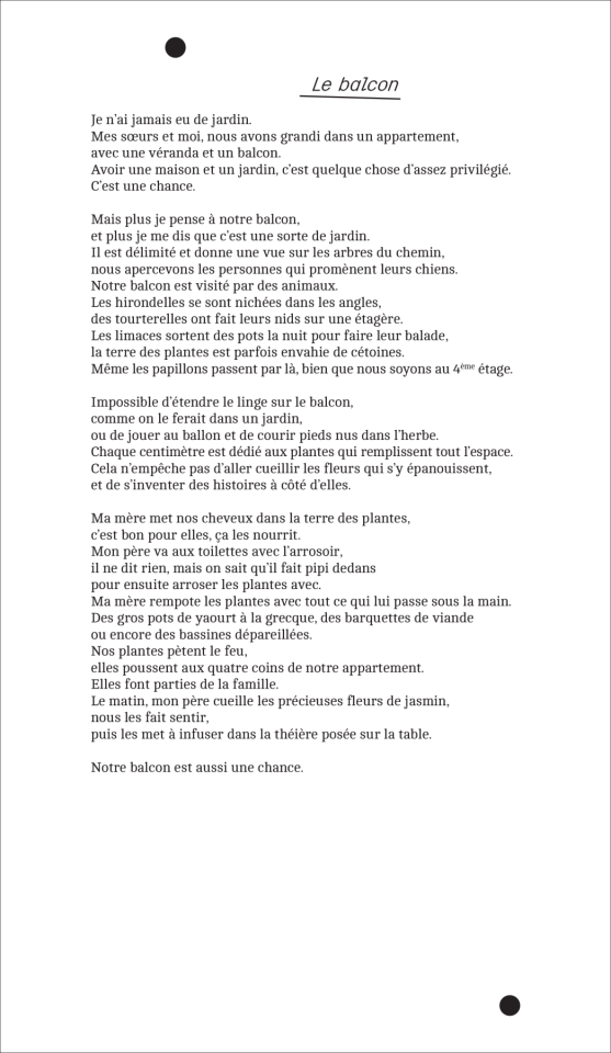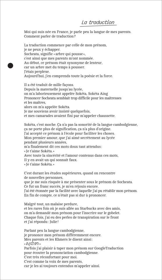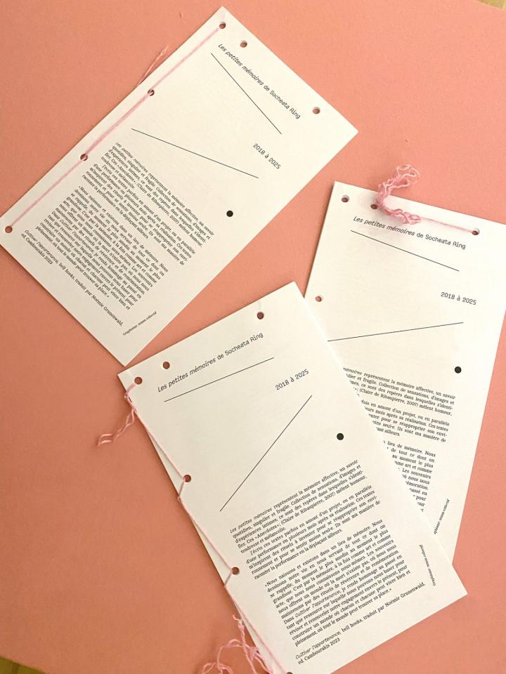 Dans ses formes, ses mots et ses gestes se reformulent alors des trajectoires et des héritages multiples, qui éclosent en fleurs nouvelles qu’elle s’amuse à replanter ici et là, partout où elle va. Du Cambodge lointain de ses parents au balcon de l’appartement familial en région parisienne, les souvenirs intimes se mélangent aux anecdotes à repartager, la recette secrète d’un bon plat à la formule magique d’une performance réussie, les racines ancestrales aux fraîches boutures prêtes à éclore. L’artiste fait feu de tout bois pour faire ressurgir les histoires oubliées – celles laissées en héritage et la sienne –, pour honorer les morts que les mémoires des vivants font perdurer, et pour panser les blessures invisibles qu’elle apprend à suturer.