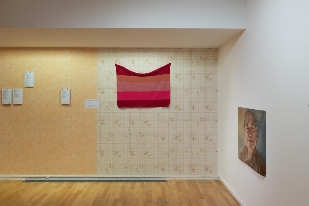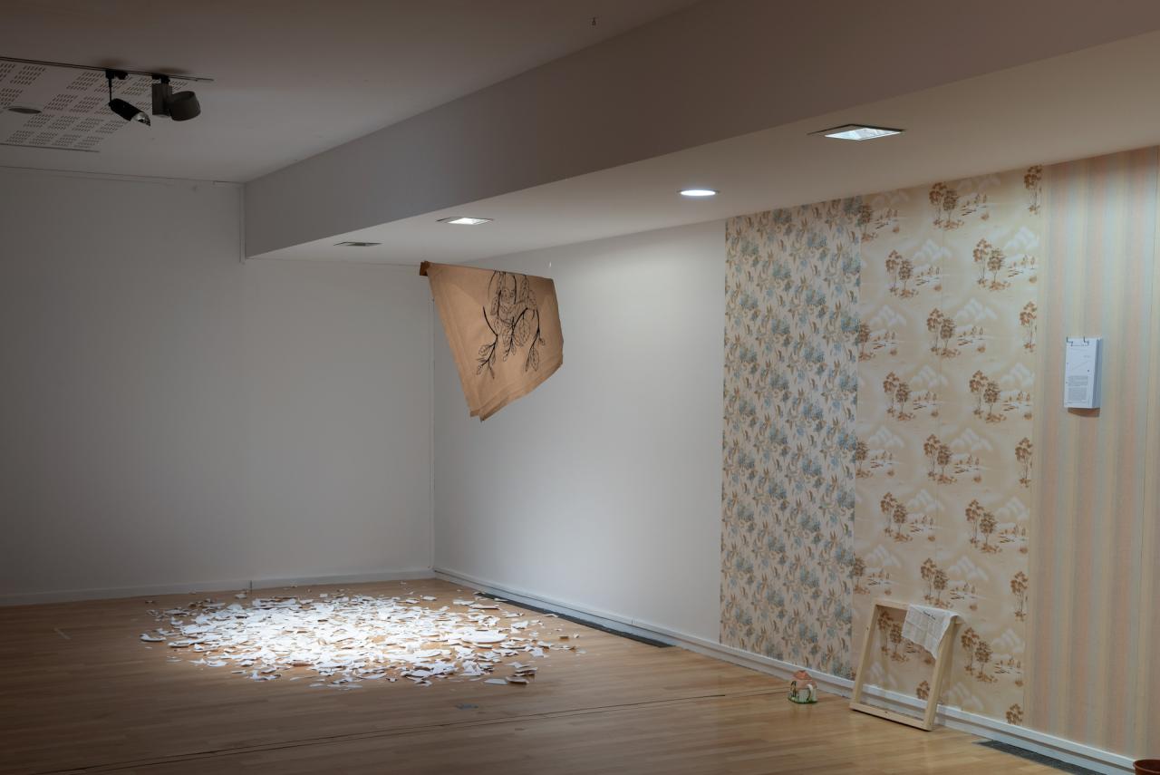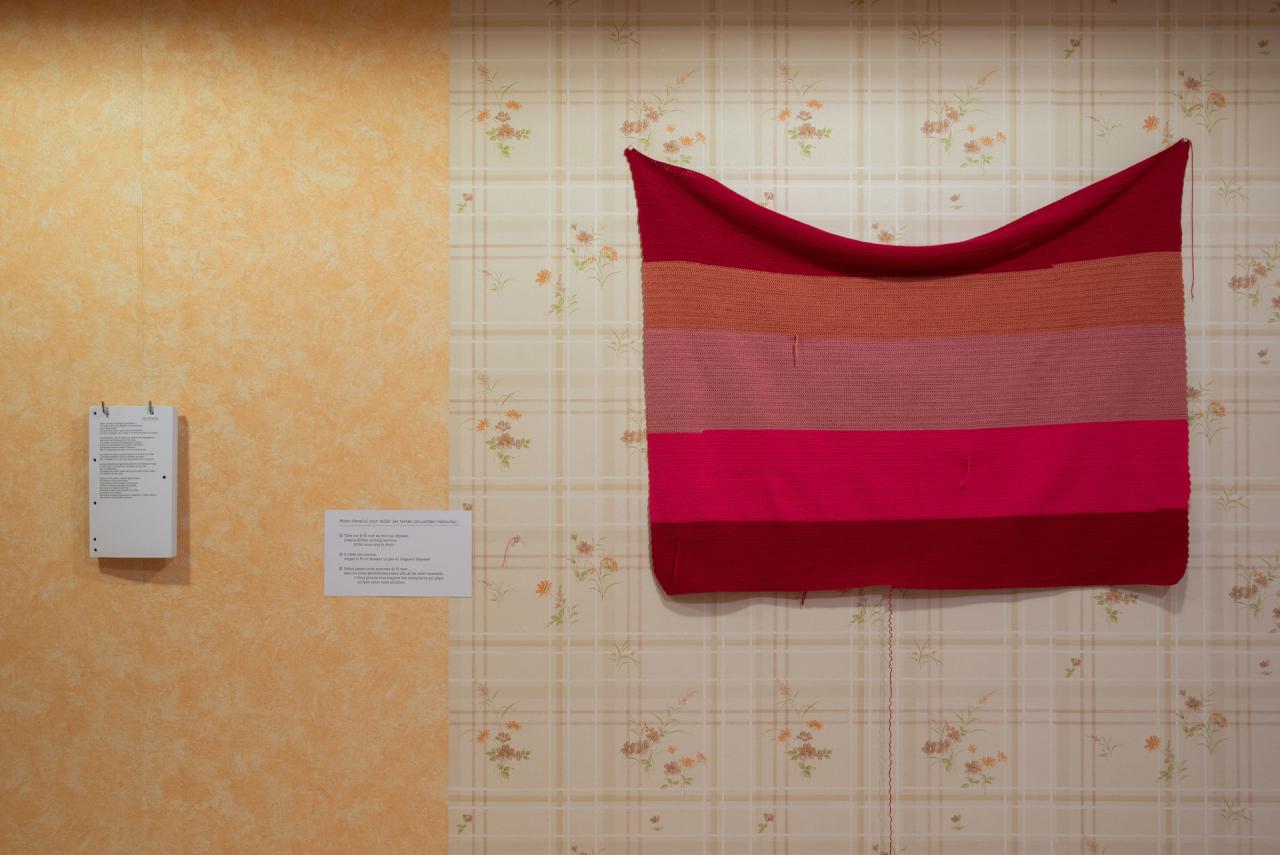 Les petites mémoires, 2018-2025, 21 textes sur feuilles, crochets en métal et papier peint, en collaboration avec mmm collectif pour le graphisme, vue du projet d’exposition Jardin secret, 2025, dans le cadre de l’exposition collective Mezzanine Sud – Prix des Amis des Abattoirs, 2025, Les Abattoirs, Musée – Frac Occitanie Toulouse, Toulouse, détail, photo mmm collectif