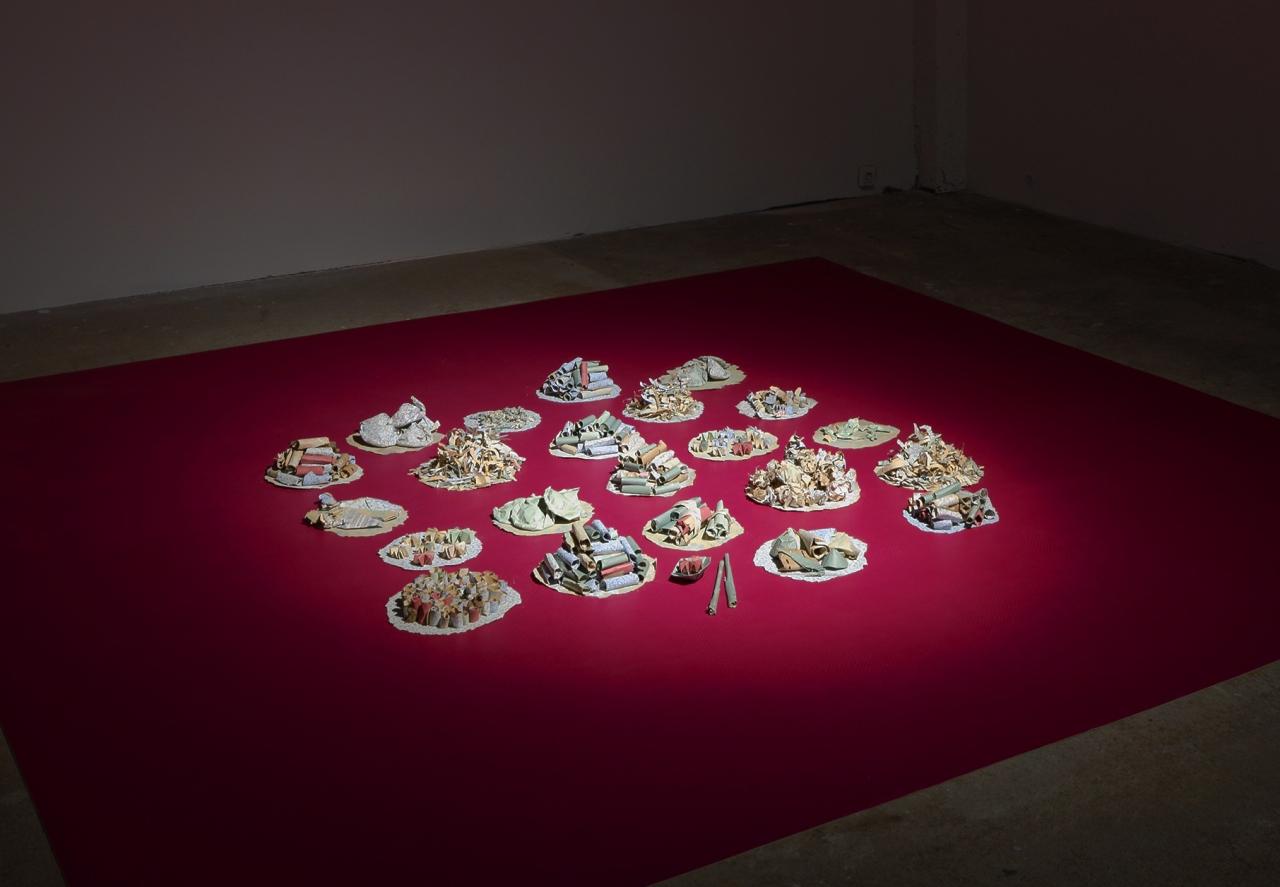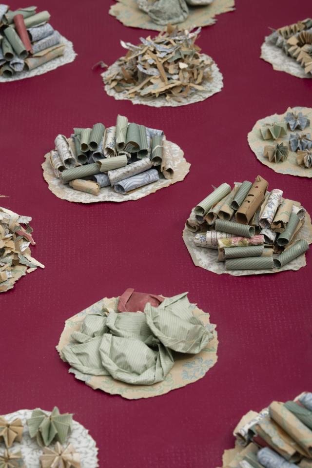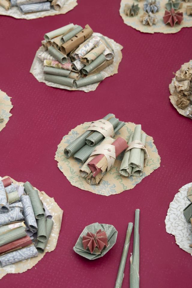Pchum Ben, Fêtes des Ancêtres, des morts et de la rédemption, est l’une des cérémonies bouddhistes les plus importantes au Cambodge et dans les diasporas. Dans les pagodes ou à la maison, les familles se rassemblent autour des plats qu’elles ont préparé avec soin, en pensant aux membres qui les ont quittées autant qu’à celles et ceux qui sont restés. Au sol ou sur la table, les assiettes s’accumulent et les mets se partagent alors que brûlent les encens allumés pour convoquer à table les vivants et les défunts. Quand La Double Absence restitue les images du festin, le banquet de papier composé par Socheata Aing propose un nouveau partage. Composé lors d’une résidence au Ditep - Dispositif Institut Educatif et Pédagogique l’Essor Jean-Plaquevent de Saint-Ignan, ce banquet est la somme des histoires accumulées dans les fibres des papiers peints arrachés des murs de l’ancienne bâtisse où sont désormais accueillis les enfants qu’elle a accompagnés le temps d’un automne. Les couches de papier et d’histoires secrètes alimentent aujourd’hui les petites assiettes offertes à la dégustation intérieure.