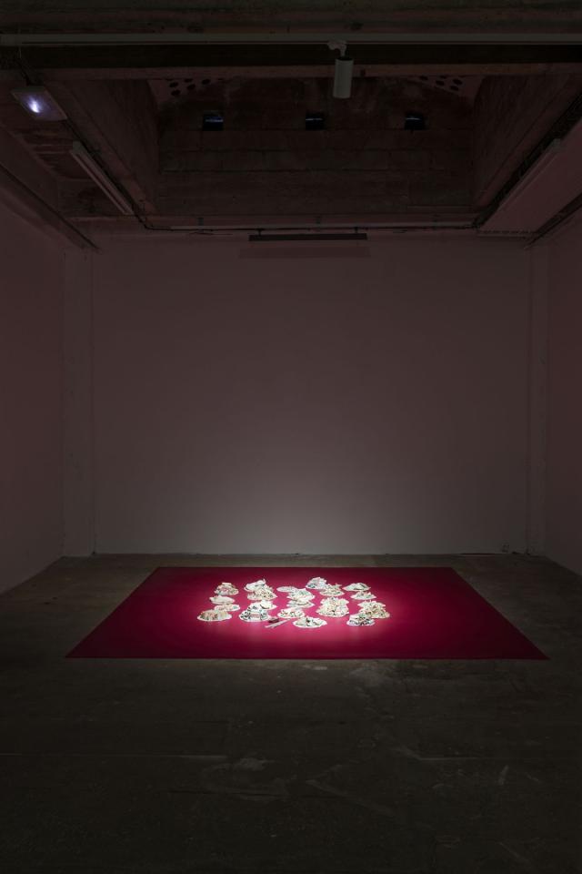 Les festin de papier peint, 2023, installation, fragments et pliage de papier peint sur lino, 300 x 300 cm, vue de l’exposition collective Une affaire de famille, 2024, Passerelle Centre d’art contemporain, Brest, détail, photo Aurélien Mole
