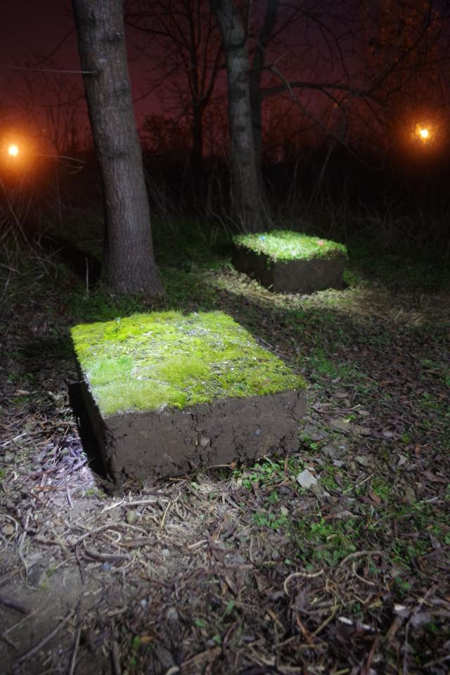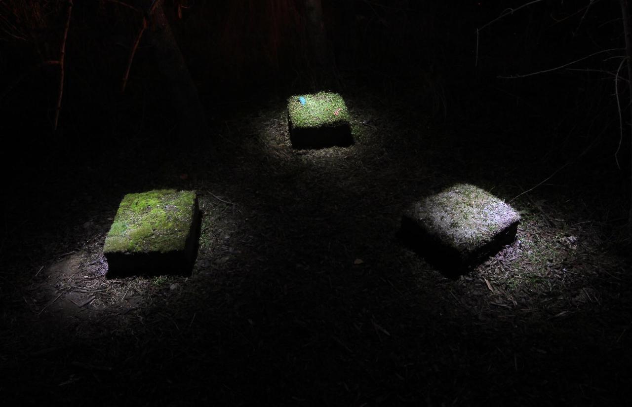 Tableaux, 2016, carottage du sol d’une déchetterie et lumières, vues de l’exposition collective Crève Hivernale, 2016, Toulouse, détail