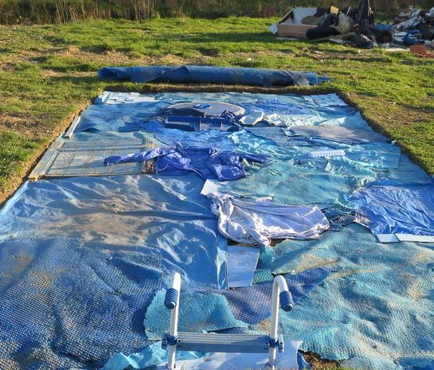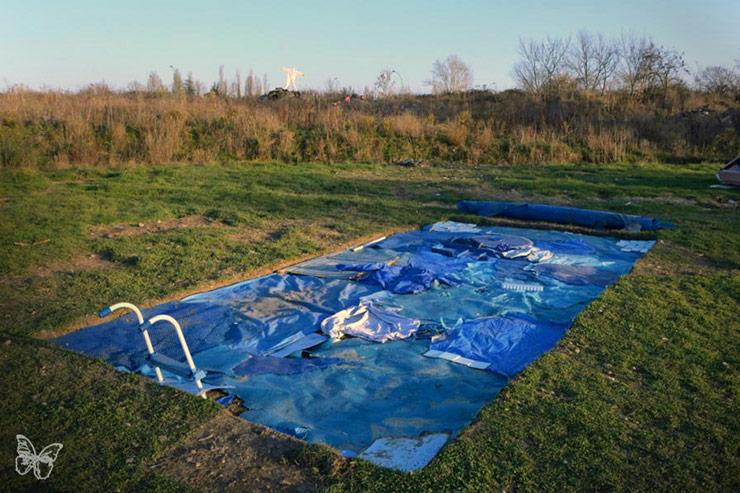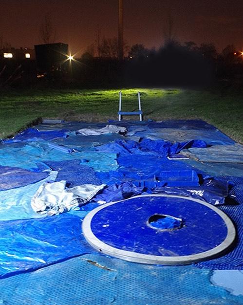 La piscine, 2016, installation, en collaboration avec Lucie Laflorentie et les enfants du camp adjacsent, trou dans le sol et déchets trouvés sur place en écho aux piscines particulières présentent dans la zone et visible sur gogle maps mais pas de la rue, vues de l’exposition collective Crève Hivernale, 2016, Toulouse