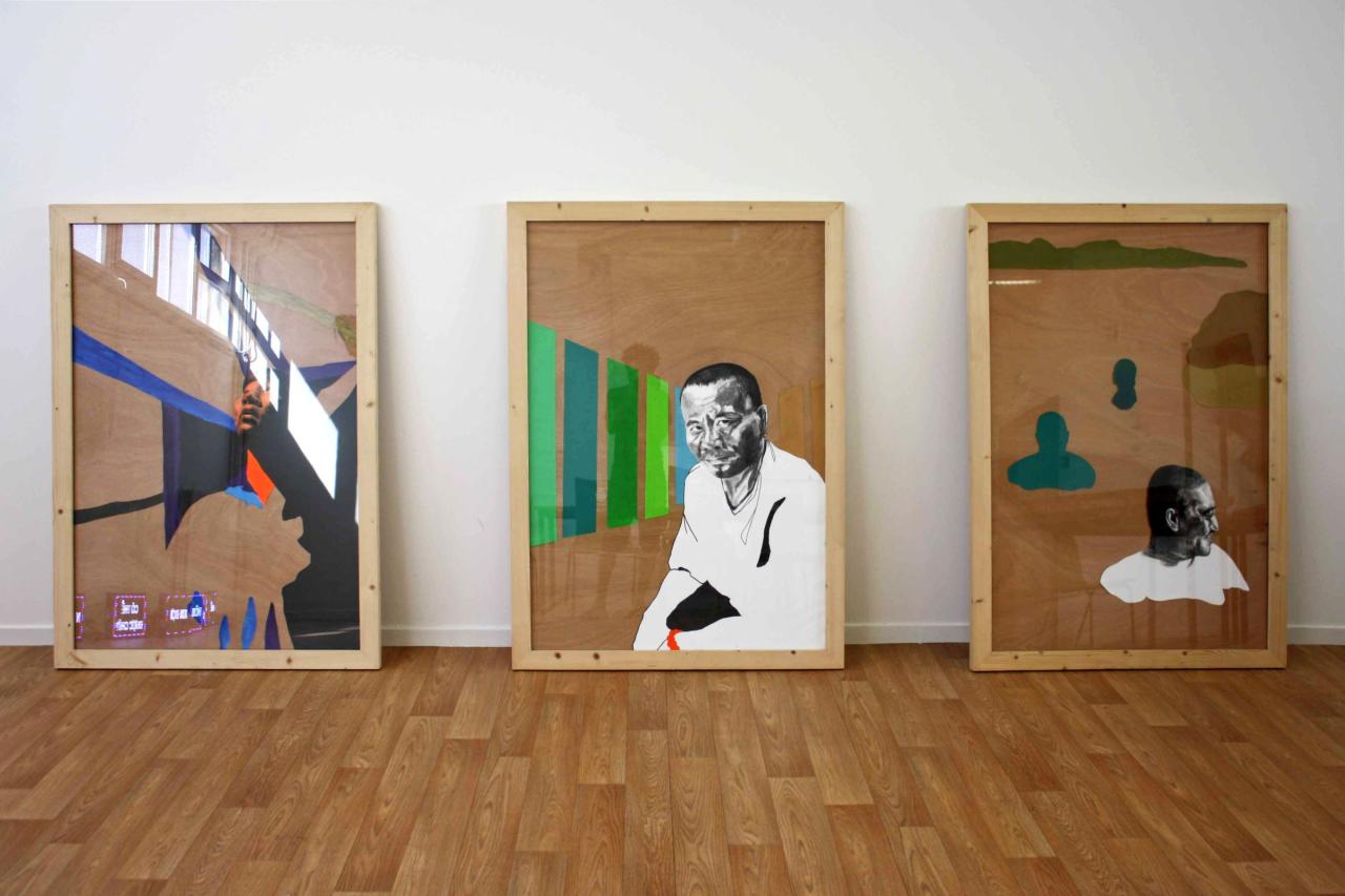 Ty, Tan, Tung, 2013, triptique, papier découpé et dessin sous cadre, 120 x 90 cm, vue de l’exposition collective MÔT HAI BA, 2014, Espace Résistance du Collège Jean Moulin, Toulouse