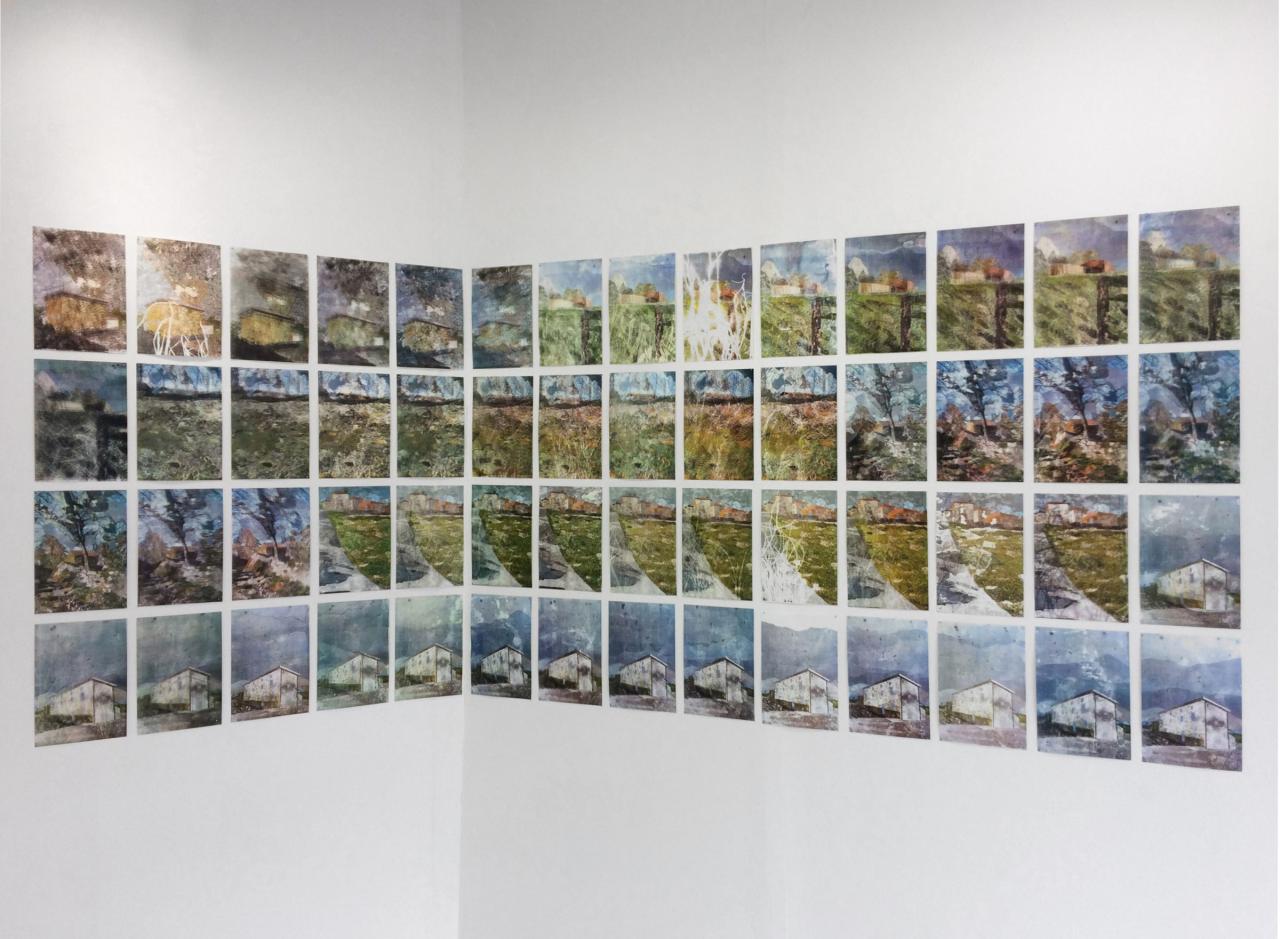 09230, 2018, série d’estampes, 30 x 21 cm chacune, vue de l’exposition personnelle Nos bordures, Galerie du Philosophe, Carla-Bayle