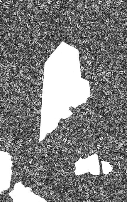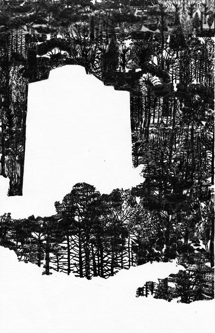 Les dessins de cette série sont réalisés en transfert Letraset® sur papier chinois. Ce matériau, bien qu’aujourd’hui obsolète, est spécifique aux architectes. Dans des compositions coupant la ville en deux (le naturel et le bâtit), il me permet d’introduire de la complexité en utilisant des motifs industrieux ou de nature, en redondance, en contradiction ou en confusion.