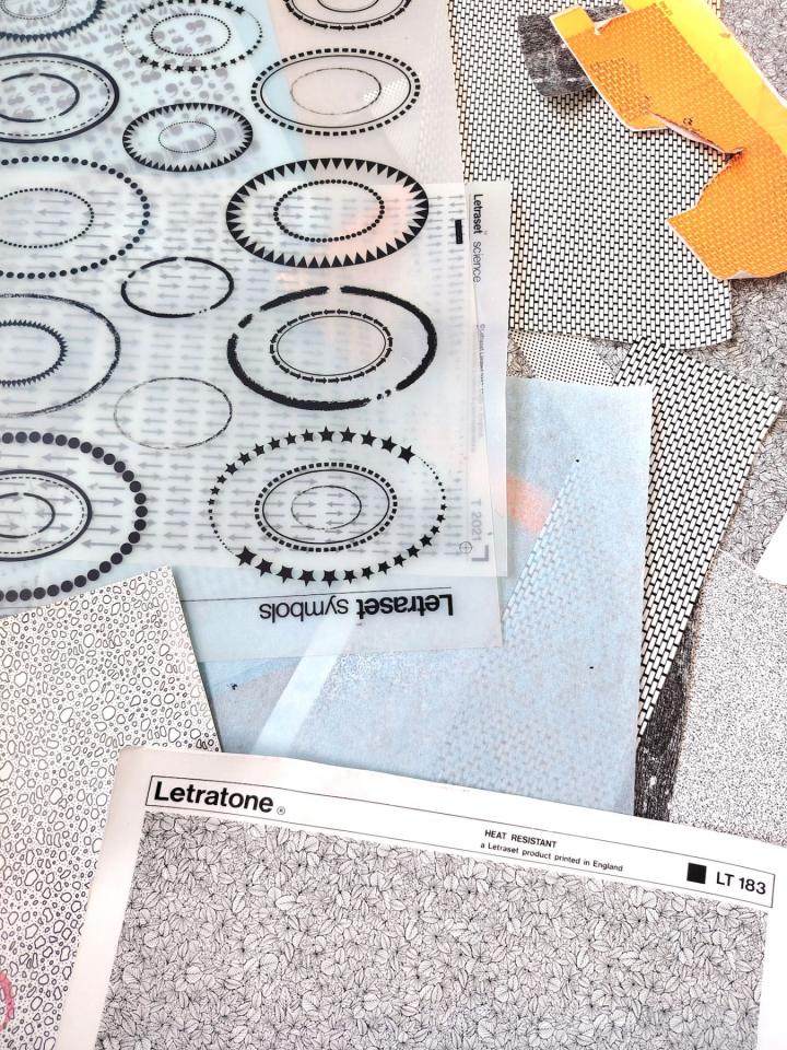 Vue d’atelier, planches de Letraset