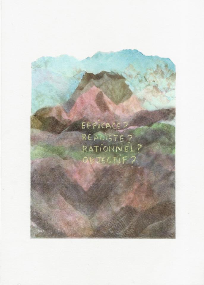 Efficace ? Réaliste ? Rationel ? Objectif ?, 2025, transfert rehaussé et gravé sur papier