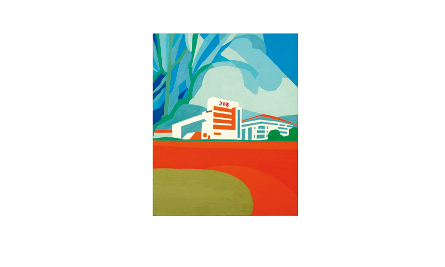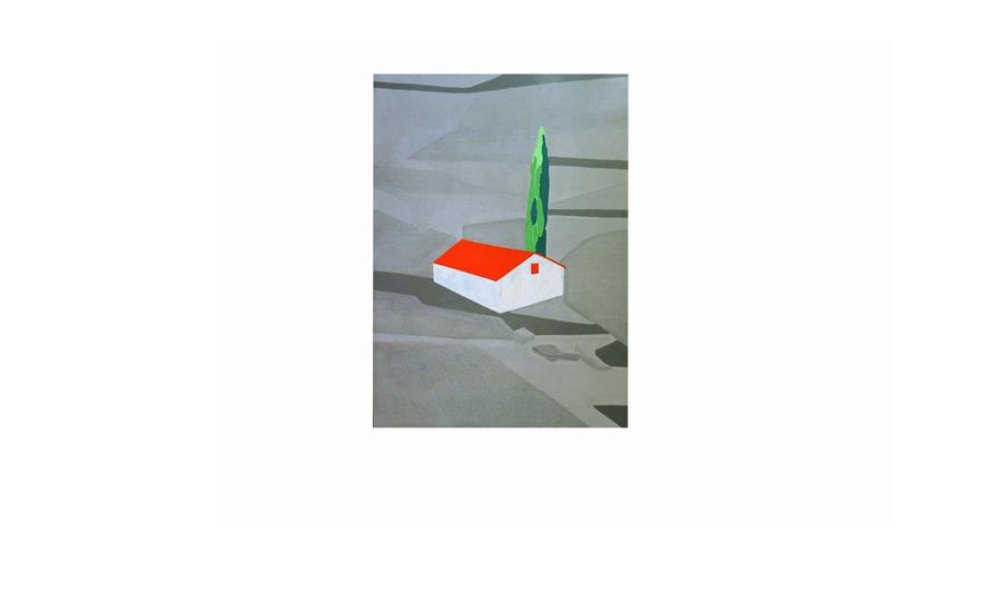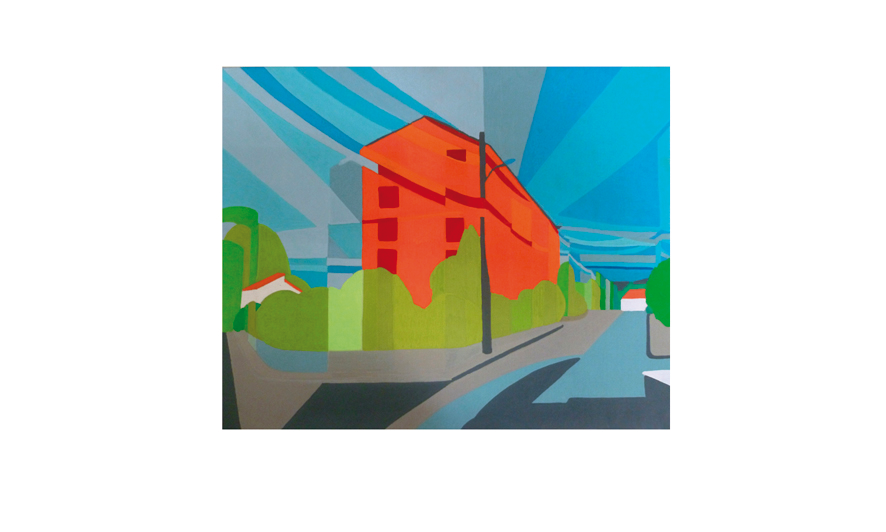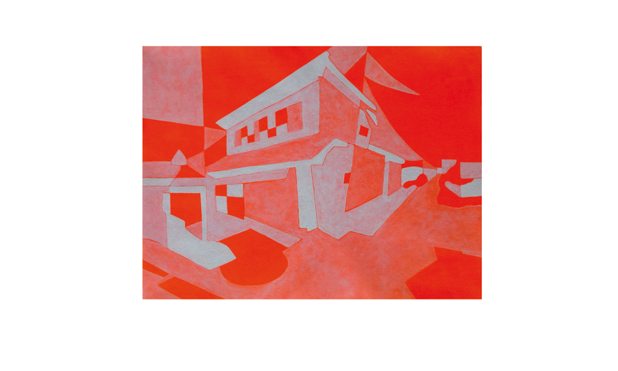Pas d’humain dans ma dernière série et pour cause, il s’agit de paysages post-apocalyptiques . Ceux de la ville vide, cet habitat de fin du monde. Nous rencontrons là un autre couple d’opposés : présence/absence. Car ici l’absence de l’homme est patente, comme une présence négative. Et les ruines intactes forment les traces de son ancienne présence. Ces traces sont quantifiables dans une saisie de l’instant géométrique. La représentation lisse, mesure, quantifie le donné. Ici le blanc recouvre et c’est l’ orange qui devient de réserve.