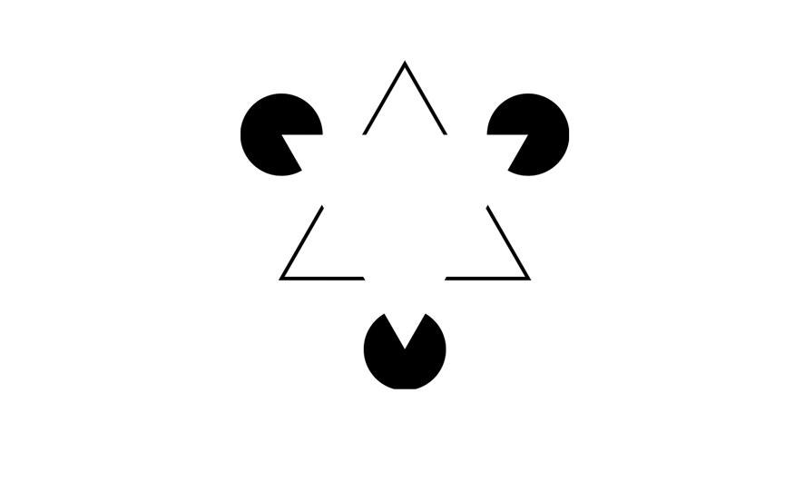 Dans le motif de kanisa, le triangle que vous voyez n’existe pas : c’est une illusion d’optique, c’est une fiction, une hallucination, un fantasme. Il n’y a là que 3 camemberts tronqués et 3 triangles sans base. La perception n’est pas la réalité. Nous interprétons le réel selon nos expériences antérieures. Nous le percevons au travers de nos désirs, à partir de ce que nous croyons savoir. Nous ne voyons que ce que nous avons déjà vu.