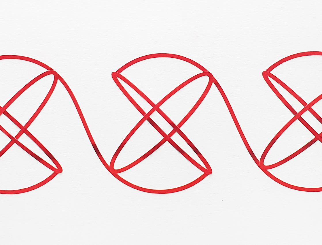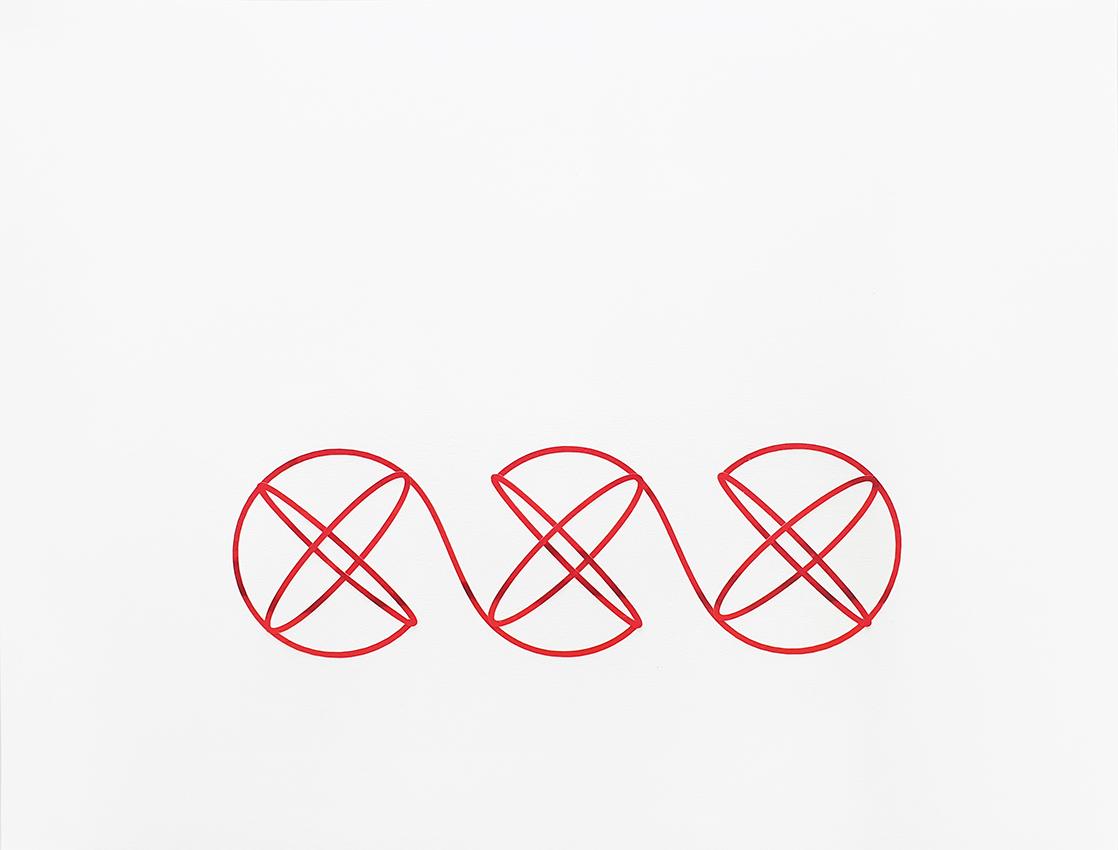 Dans Armilles (2020), les anneaux enchâssés figurent trois globes reliés pour former un ensemble, révélant des possibles voûtes concaves et convexes, des espaces à la fois intérieurs et extérieurs, déplaçant les axes de révolutions et les centres de gravité. Il est aussi question de cosmos dans la manière dont j’ai procédé pour faire ce dessin, constitué de papier teinté, découpé et collé sur une feuille blanche. L’encre est d’abord déposée à grandes eaux sur le papier. En séchant, la surface laisse des zones plus ou moins denses. Cette fluidité me renvoie à la voûte céleste, dans laquelle le regard peut plonger.