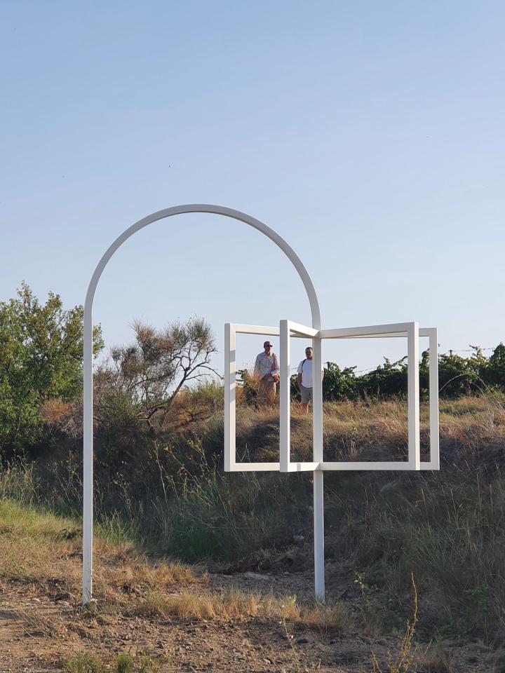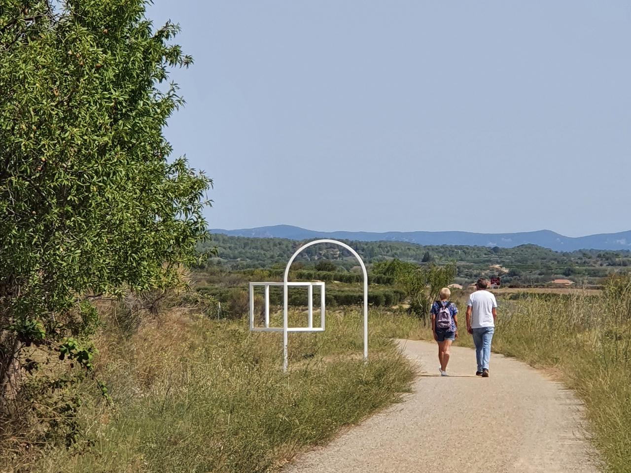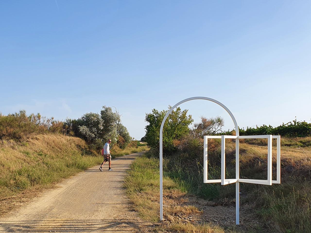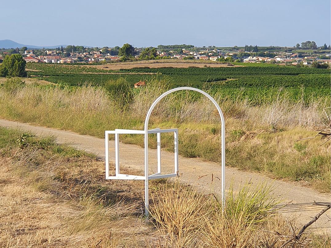Cette sculpture en métal dessine dans l’espace les contours de géométries élémentaires : des rectangles portés par une arche. Les premières formes évoquent un livre ouvert, offrant un cadrage sur les collines - les coteaux, les pinèdes et les vignes - tandis que la voûte fait référence au passé ferroviaire de la voie verte, particulièrement au pont situé à quelques foulées.