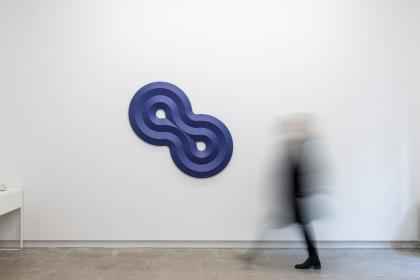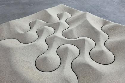 Dès l’entrée de la galerie, à l’échelle de notre corps, on aperçoit un bas-relief bleu à la trame ondulatoire. La matrice incarne un signal qui introduit et irrigue l’exposition. Les travaux déclinés par Suzy Lelièvre se caractérisent par des mouvements, gestes et formes répétés, nœuds distordus et ré-investis. Souvent inspirée par les mathématiques, l’artiste formule des énoncés, des postulats plausibles. Certains anneaux effleurent une lecture plus fonctionnelle de l’objet, tel le ruban jaune en bascule. En son centre, pourrait être accueillie une sphère. Le va-et-vient est à peine suggéré, comme dans la plupart des travaux de l’artiste. Suzy Lelièvre développe une recherche plurielle, pétrie par les méthodes du design et les procédés de production. Elle extrait des matrices pour définir ses processus de travail. Cette stratégie empruntée à la pensée de Michel de Certeau dans L’invention du quotidien définit ses règles du jeu. À l’intérieur, des tactiques opèrent : l’utilisation de structures emblématiques auxquelles Suzy Lelièvre fait subir des déformations continues révèle une démarche à la fois sensible et rationnelle. Aussi, certains motifs sont directement reliés au réel. Ici, une structure sinueuse faite de sable est posée au sol. En arrière-plan, le paysage côtier et sableux du pourtour méditerranéen. On y laisse parfois glisser en fines cascades le sable fin entre ses doigts. Les petits talus se déversent alors dans un bruit étouffé. D’autres pentes sont formées par l’action d’une coulure où la cire et le sable s’enlacent et viennent recouvrir à chaud la surface d’un moule.