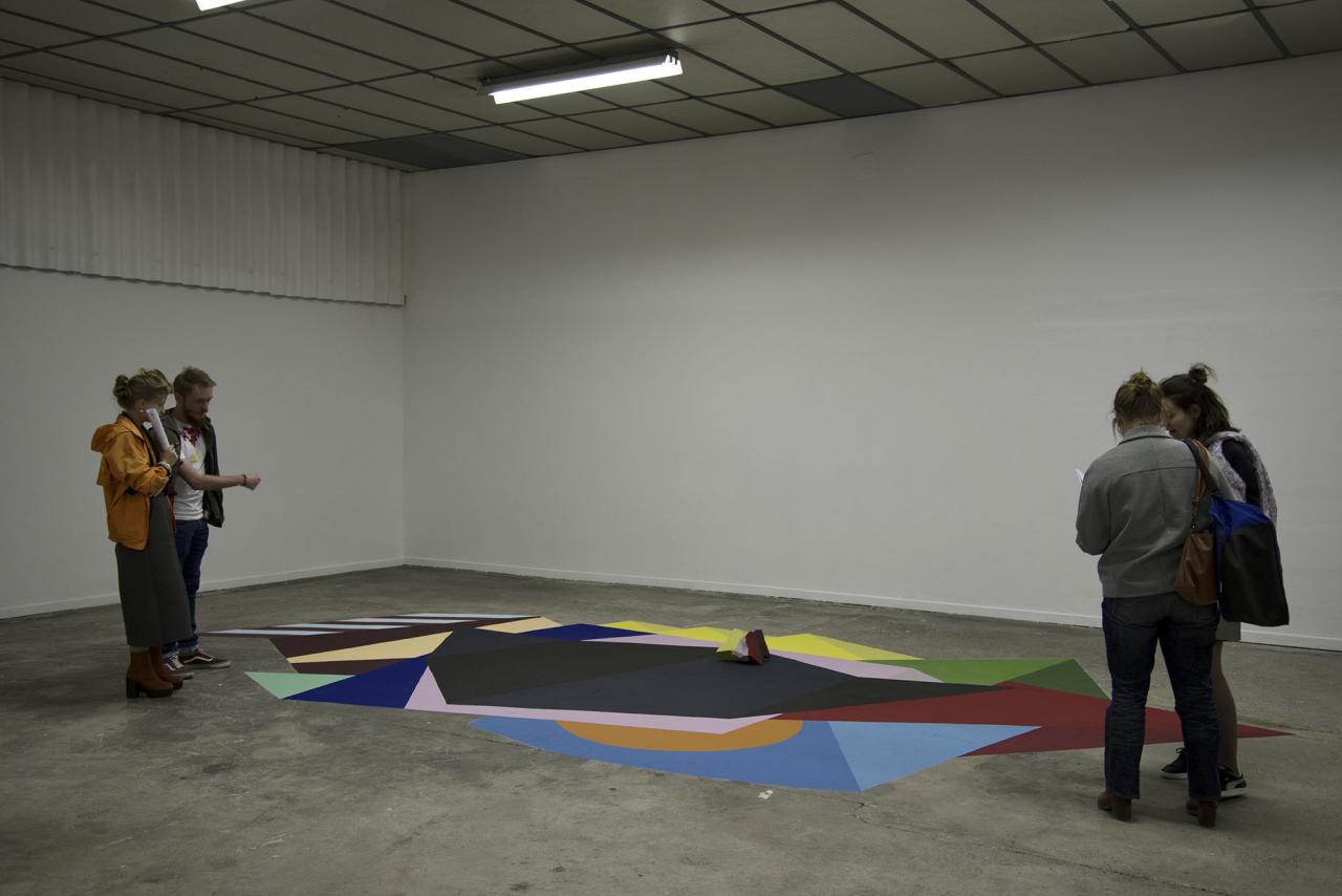 Mettre à plat le coeur au ventre, 2016, acrylique au sol et acrylique sur basalte, 7 x 4 m, vue d’exposition au BBB centre d’art, Toulouse, photo Yohann Gozard