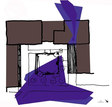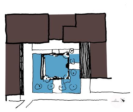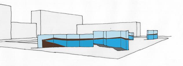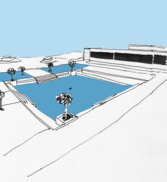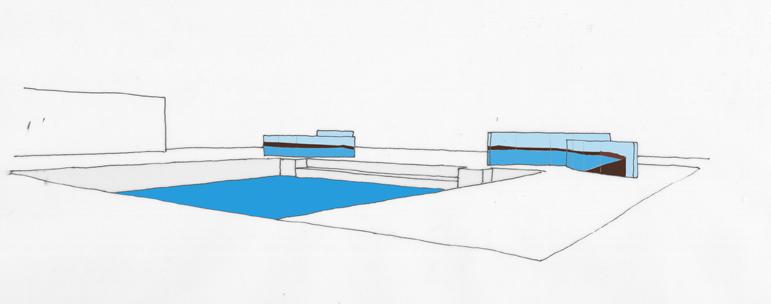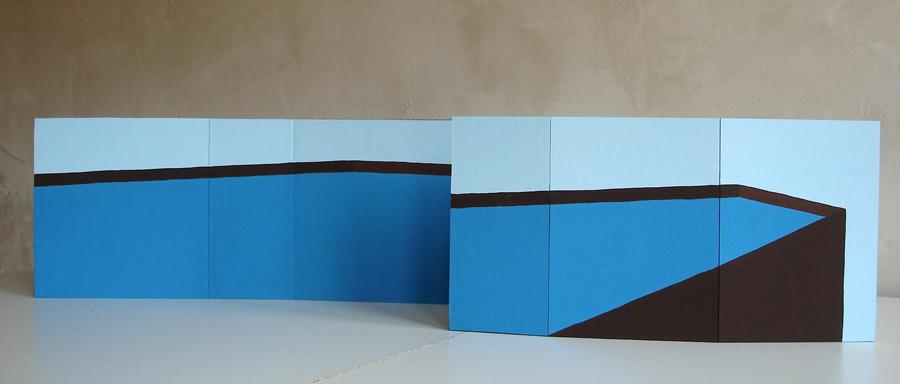 Dressés stratégiquement en fonction de la circulation des occupants du lieu et des vents dominants, quatre paravents en béton, peints recto/verso, dialoguent avec l’architecture d’un bâtiment de style le corbusien. (…) Les paravents réunis par couple délimitent ici un espace énigmatique. Articulant un lieu de passage, ils déjouent les trajectoires et les circulations attendues. En faisant converger les regards au centre de l’atrium, en même temps qu’ils nous invitent mentalement à dépasser leur propre présence, ils créent un aller-retour entre réel et imaginaire. L’illusion optique créée par la peinture des paravents semble ainsi réfléchir et prolonger le sol bleu de l’atrium, tel un mirage par une belle journée d’été.